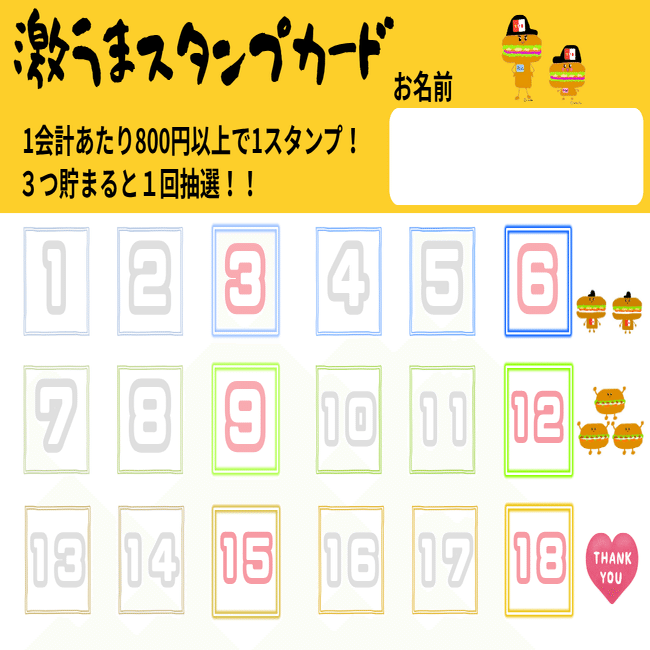 スタンプカードとしては、1回のお会計で800円以上となれば1回スタンプを押させていただくという仕組みでございます。