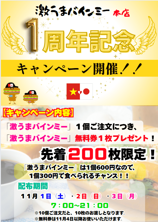激うまバインミー1周年!1個買ったら1個無料キャンペーン実施します!