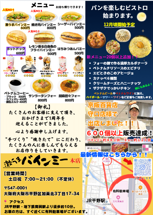 まもなくお店の営業が1周年を迎える激うまバインミーです!