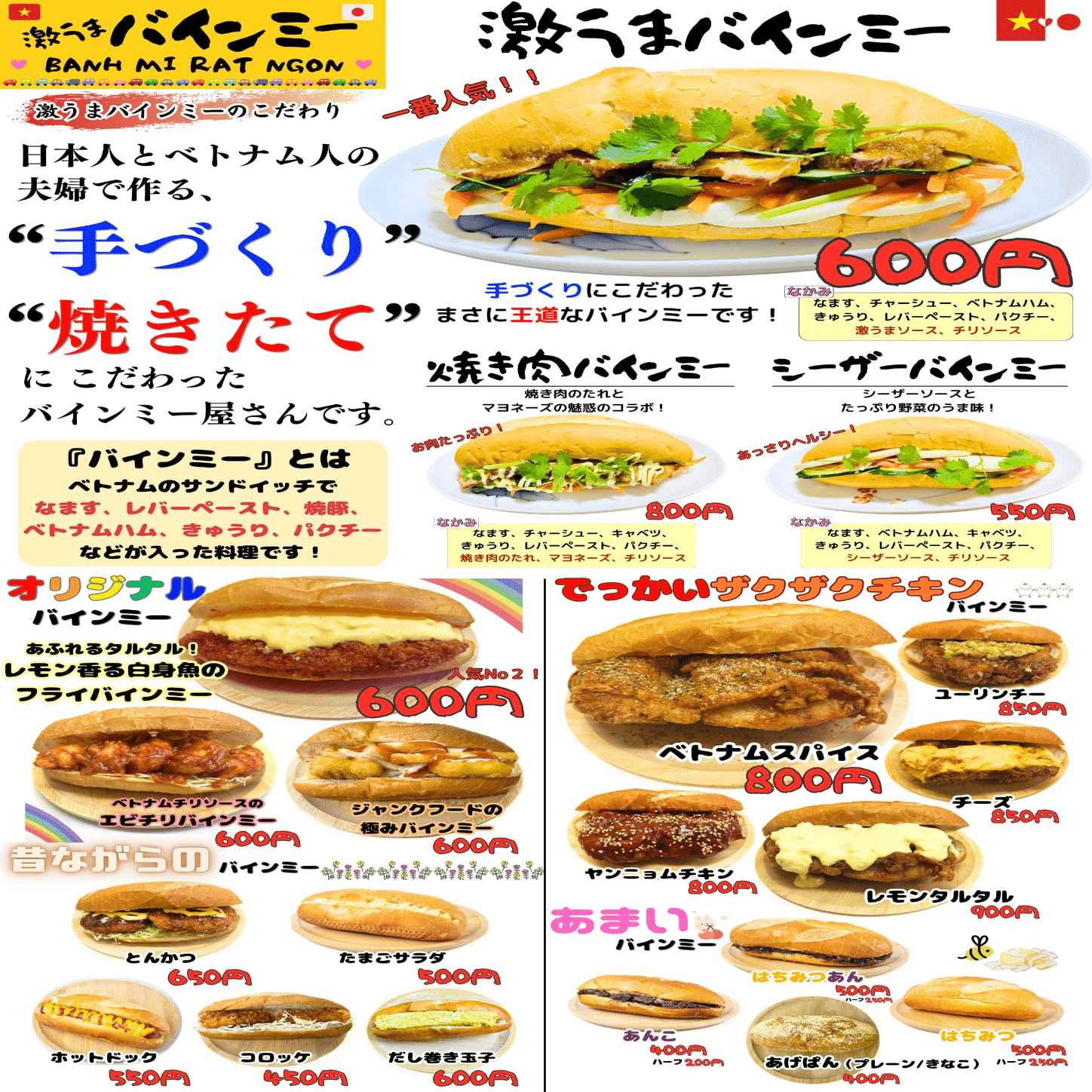 激うまバインミーは日本でまだまだ認知の少ないベトナム料理で、さらに認知の少ないバインミーを中心に販売するお店をしております。