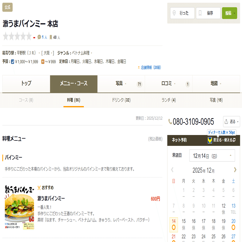 そんなわけでみなさんどうか頑張って入力した激うまバインミーの食べログページを見てみて頂けると嬉しいです!