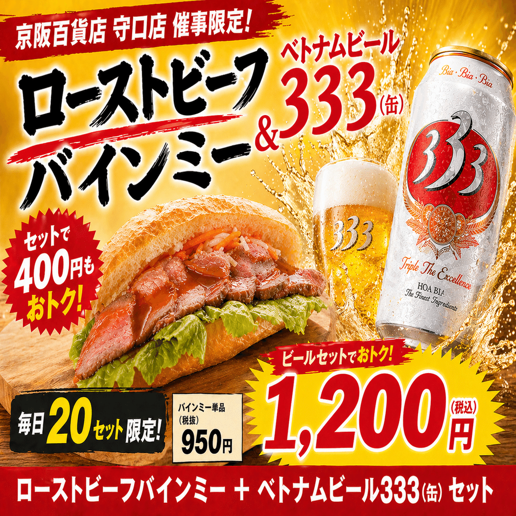 ローストビーフバインミー1個とベトナムビール333がセットで1200円になるというキャンペーンでございます!